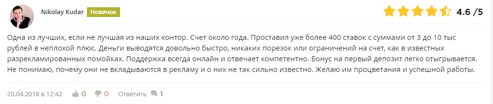 Реально многие ценят эту фирму за удобства и надежность. А тот факт, что она предлагает выгодные коэффициенты делает ей отличную рекламу на рынке.